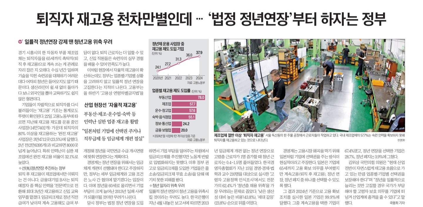 그런데도 정부는 이러한 현장 상황을 고려하지 않고 '법정 정년 65세 연장'을 1차 입법 과제로 추진 중입니다.