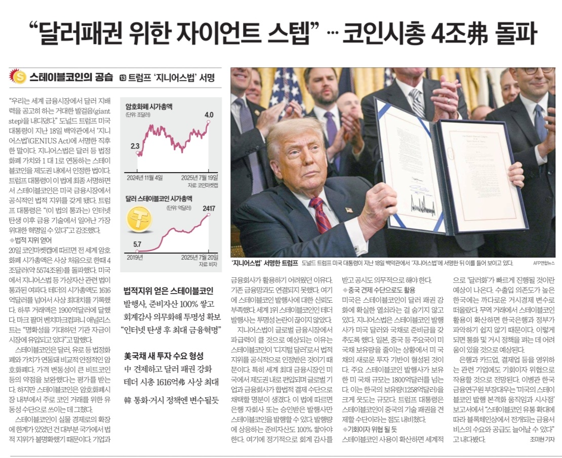 미국 대통령 도널드 트럼프가 "지니어스 법"에 서명하며 세계 금융시장에 강한 메시지를 던졌습니다.
